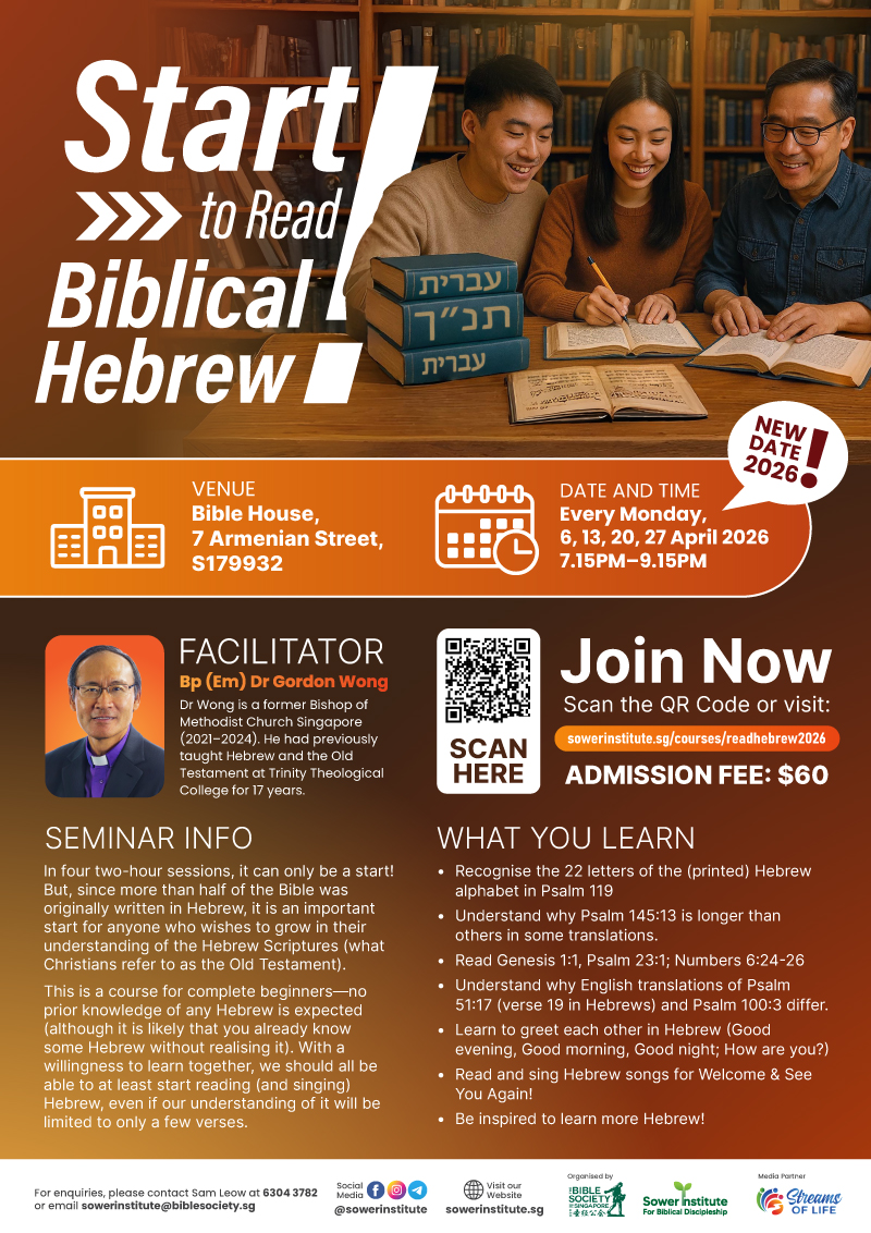 For enquiries, please contact Sam Leow at 6304 3782 or email sowerinstitute@biblesociety.sg